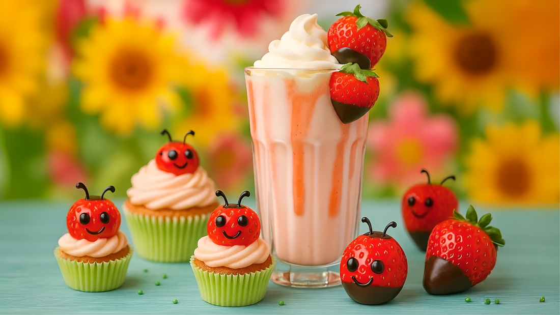 Decorate with Delight! Now, here comes the bug-tastic part! Add a ladybug vibe by topping your milkshake with whipped cream and using tiny chocolate chips as “spots.” Maybe even a cute strawberry slice on the top for its "head!"
