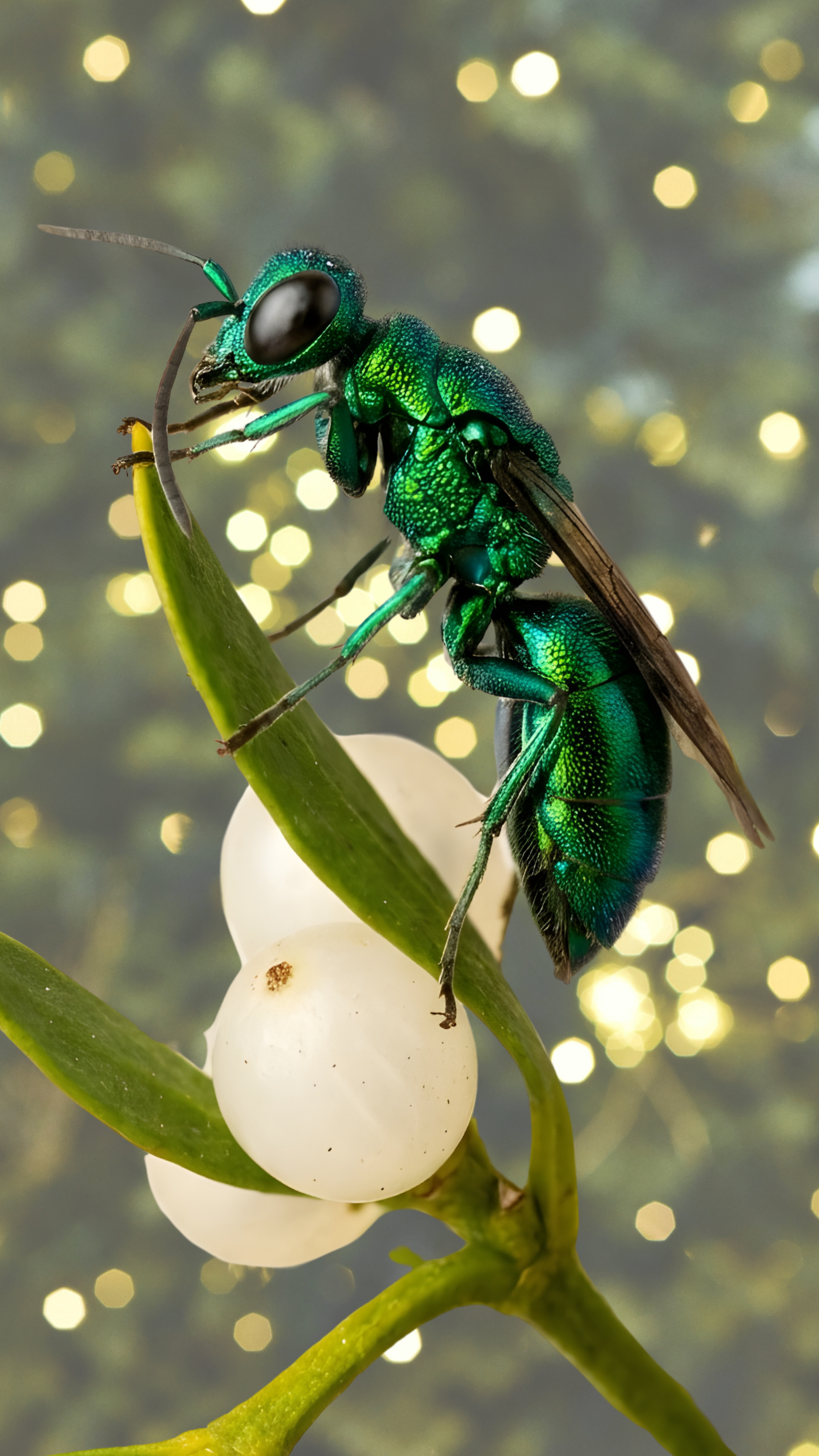 Known for its brilliant, metallic blue-green exoskeleton, this wasp looks exactly like a living gemstone. In the wild, they are famous for their complex behavior, but here, this solitary beauty is just taking a moment to groom itself on a sprig of mistletoe.